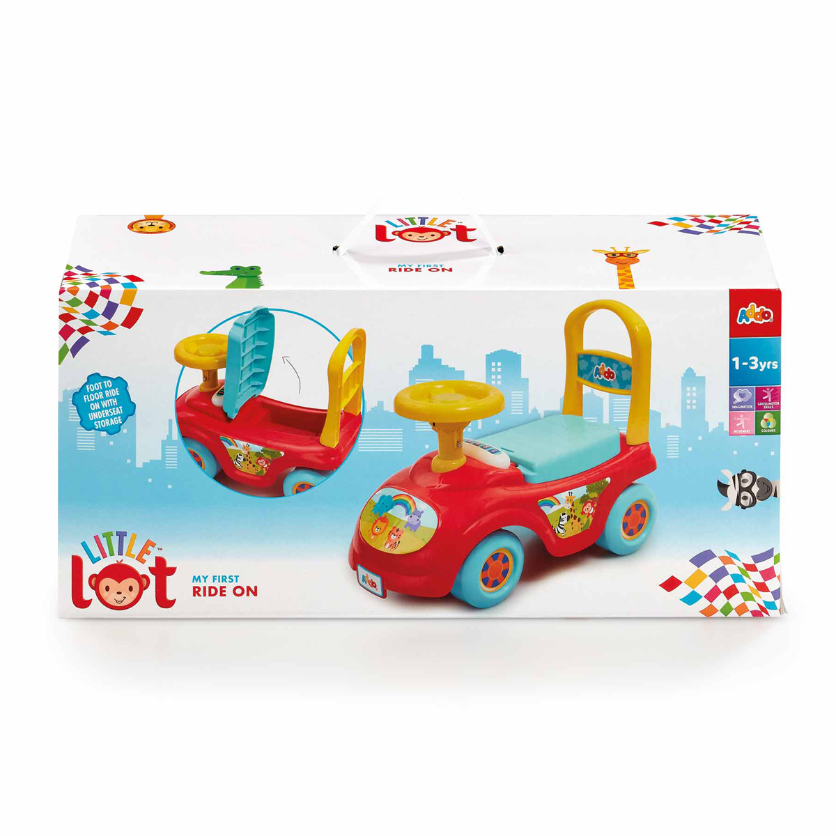 Ata mund të lëvizin timonin dhe të bijnë borinë gjithashtu! Ky mjet Ride-On vjen me një dizajn të ndritshëm të kuq dhe blu, me sticker-a miqësorë të kafshëve si dekor.