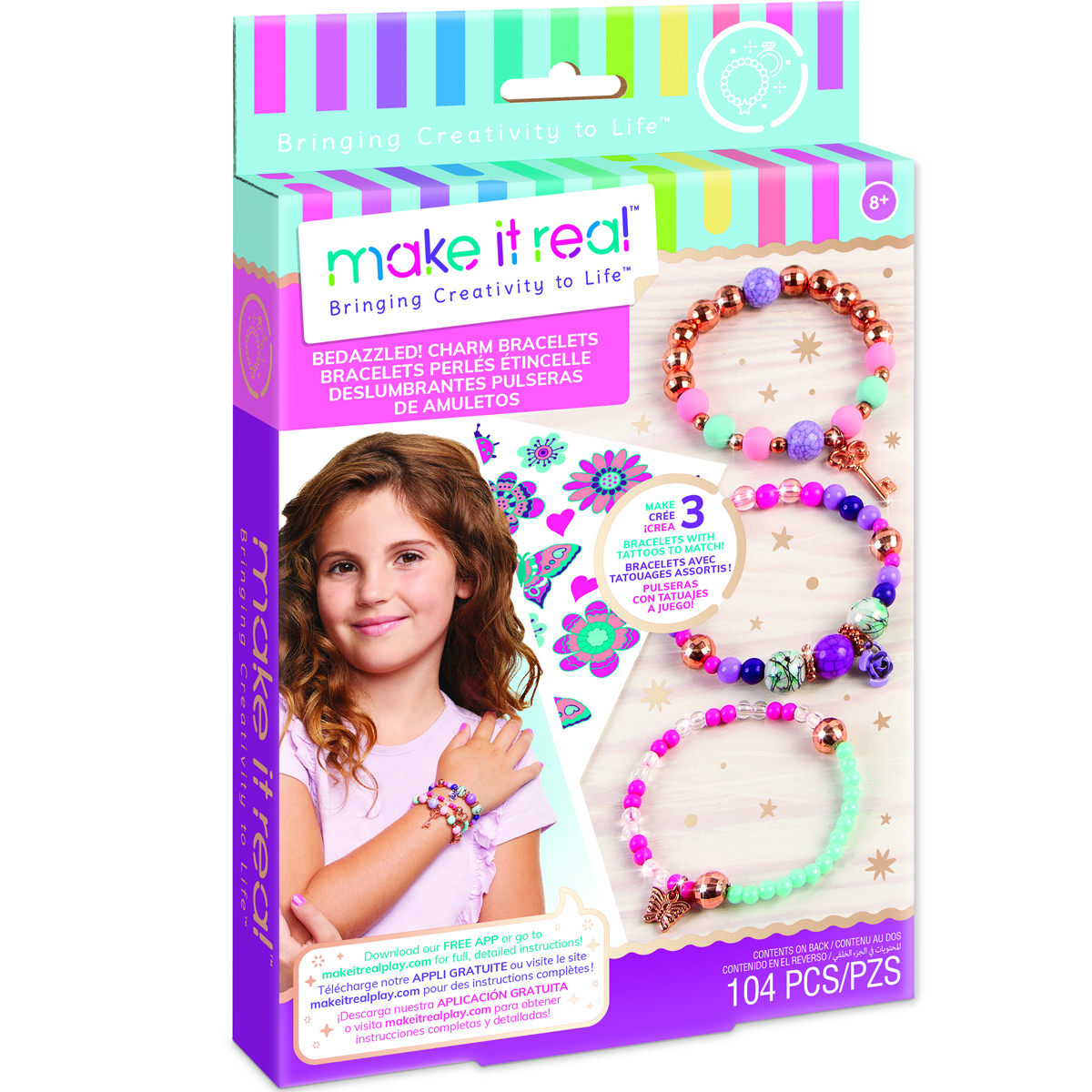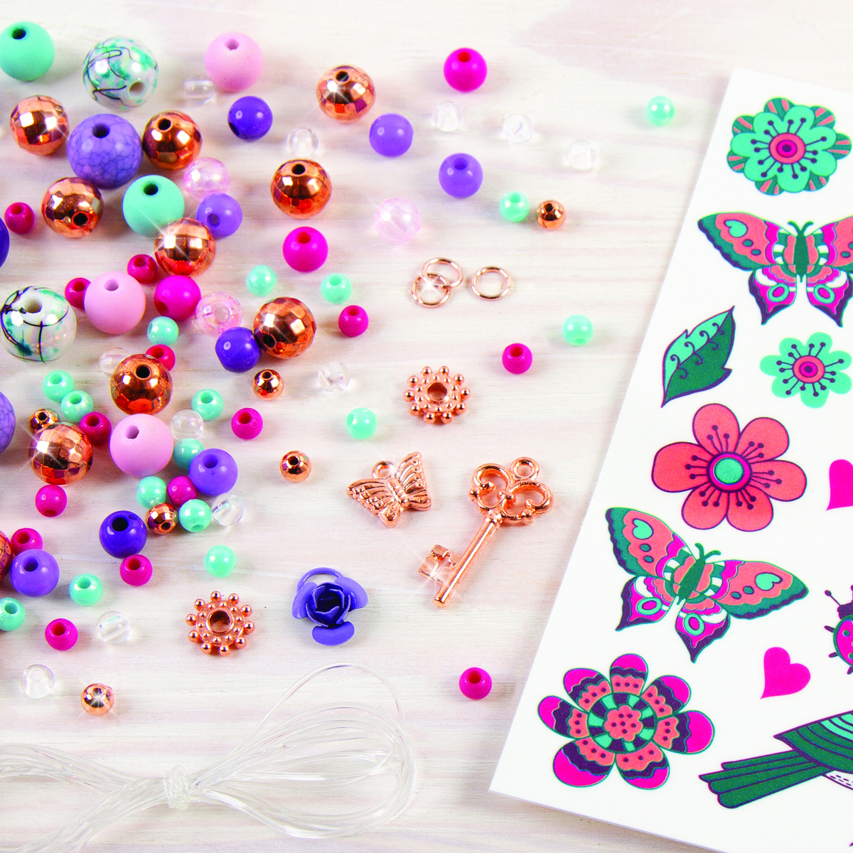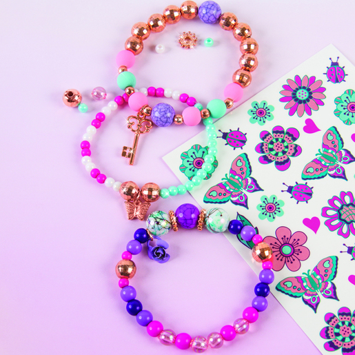 • Përfshin një përzgjedhje perlash dhe medaljonesh, plus një fletë të plotë tatuazhesh për të përputhur byzylykët